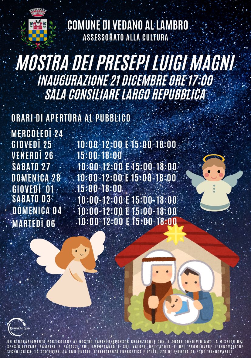 Anche quest'anno verrà allestita in Sala Consiliare la tradizionale Mostra dei Presepi "Luigi Magni", una ricca esposizione di presepi e opere d'arte ispirate al tema della natività.