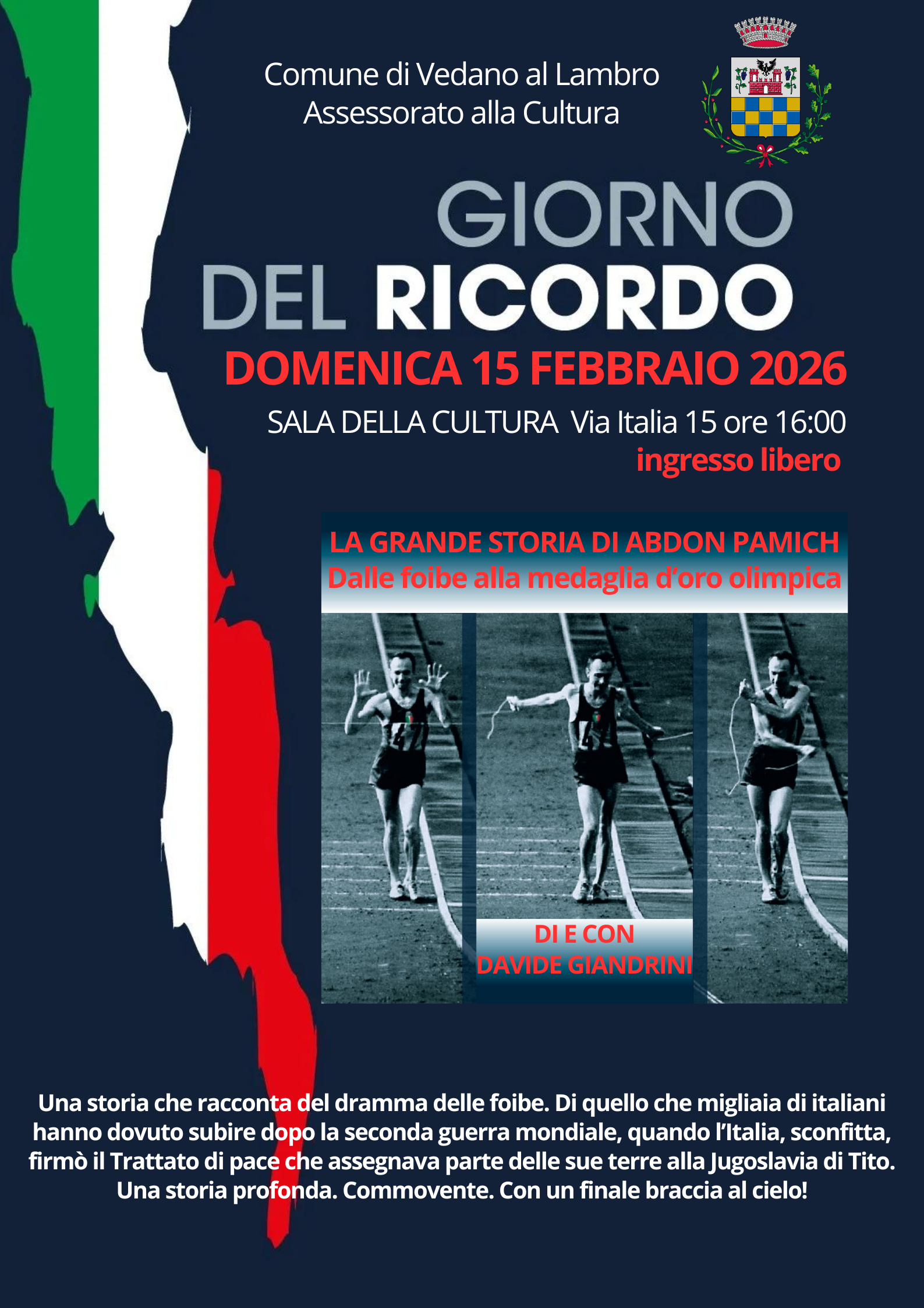 L'Amministrazione comunale, l'Assessorato alla Cultura e la Biblioteca invitano la cittadinanza allo spettacolo teatrale a cura di Davide Giandrini "La grande storia di Abdon Pamich - dalle Foibe alla medaglia d'oro".