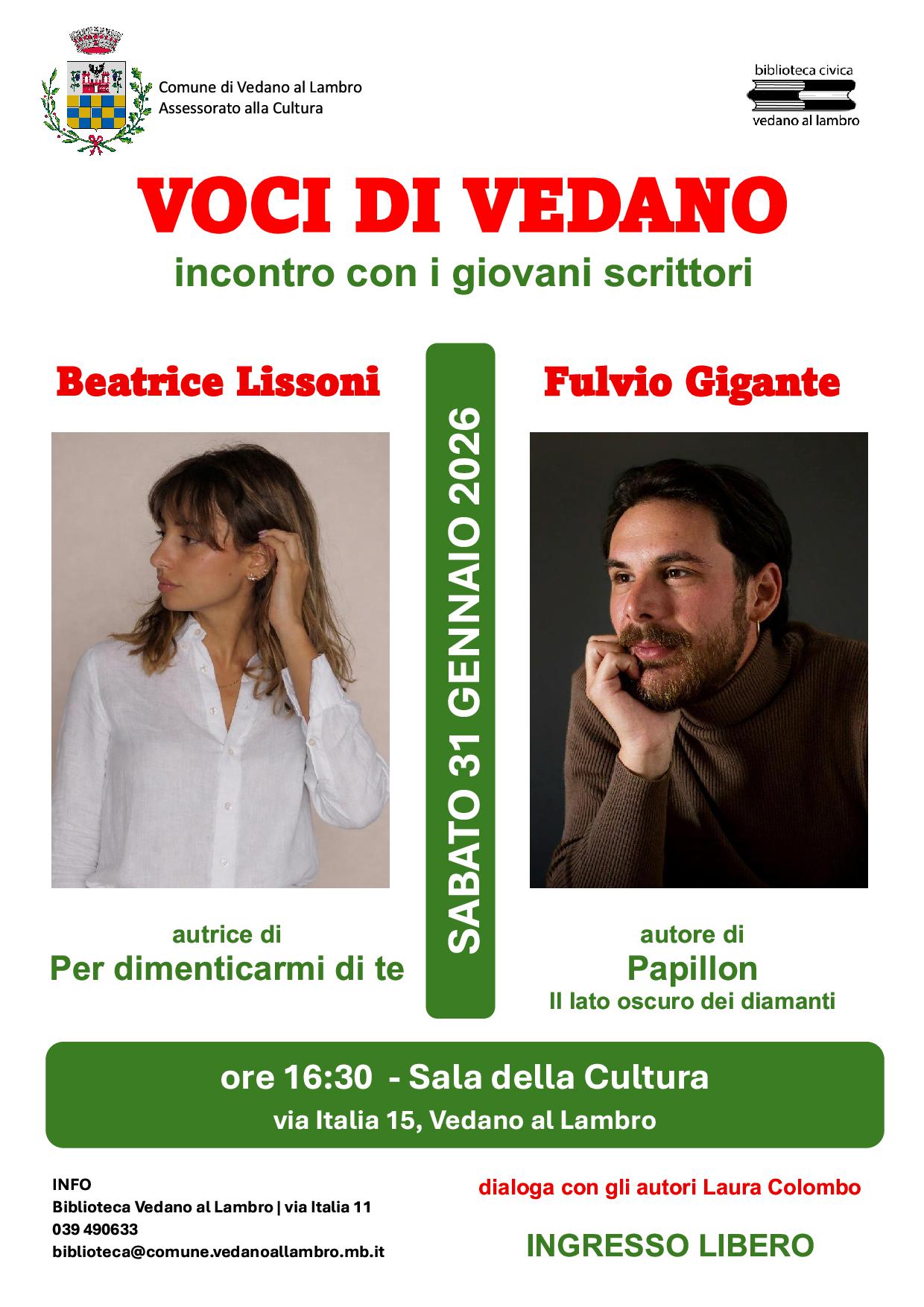 L'Assessorato alla Cultura è lieto di invitarvi alla presentazione delle opere prime di due giovani scrittori di Vedano: